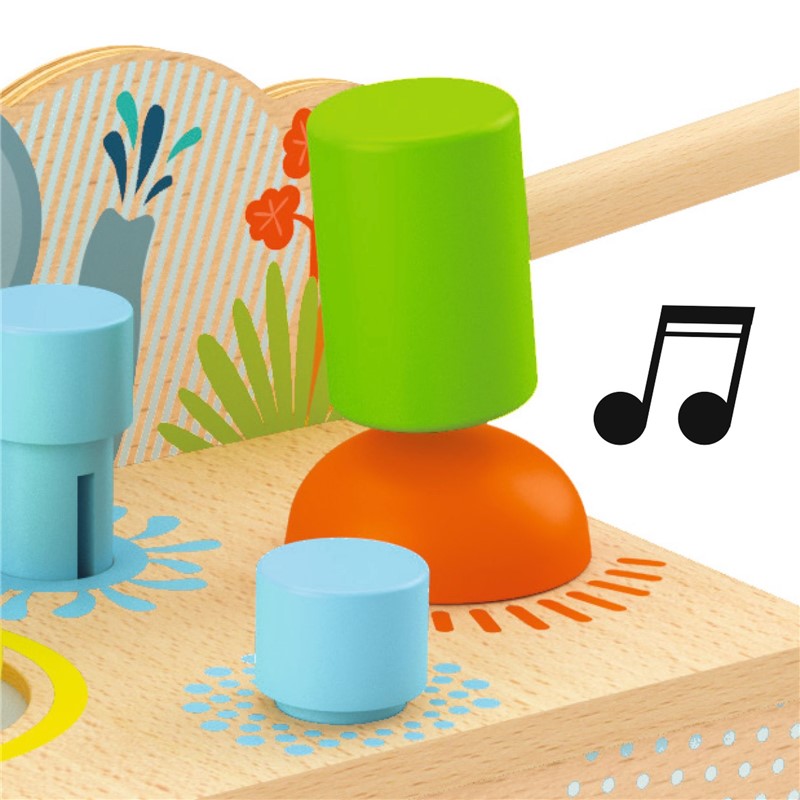 Una mesa con formas de madera natural y colores suaves que representa la selva. Consta de diferentes colores y formas para que el niño aprenda a golpear con el martillo. El niño golpea las formas en los orificios correspondientes, guiado por la forma de la pieza, así como por su color.