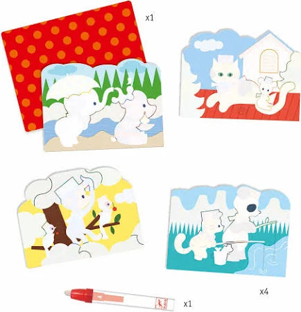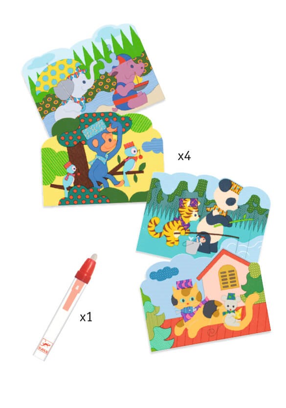 ¡Prepárate para una actividad mágica y sin manchas con este kit para colorear de Djeco! Con el lápiz de agua, tu pequeño artista podrá revelar los secretos que se esconden en el cielo. Solo tiene que rellenar el lápiz y pasar la punta por las zonas blancas de los dibujos. ¡Es increíble ver cómo los colores y las imágenes aparecen al instante!