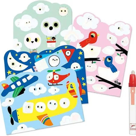 ¡Prepárate para una actividad mágica y sin manchas con este kit para colorear de Djeco! Con el lápiz de agua, tu pequeño artista podrá revelar los secretos que se esconden en el cielo. Solo tiene que rellenar el lápiz y pasar la punta por las zonas blancas de los dibujos. ¡Es increíble ver cómo los colores y las imágenes aparecen al instante!
