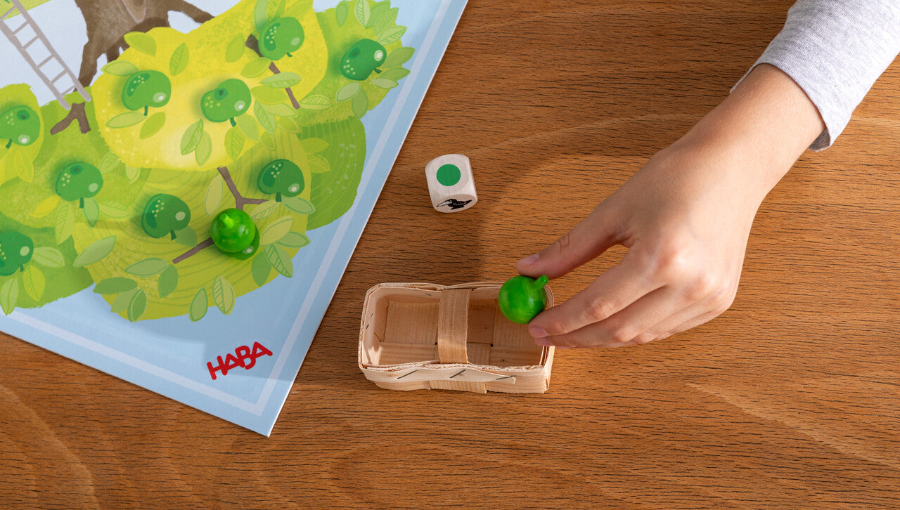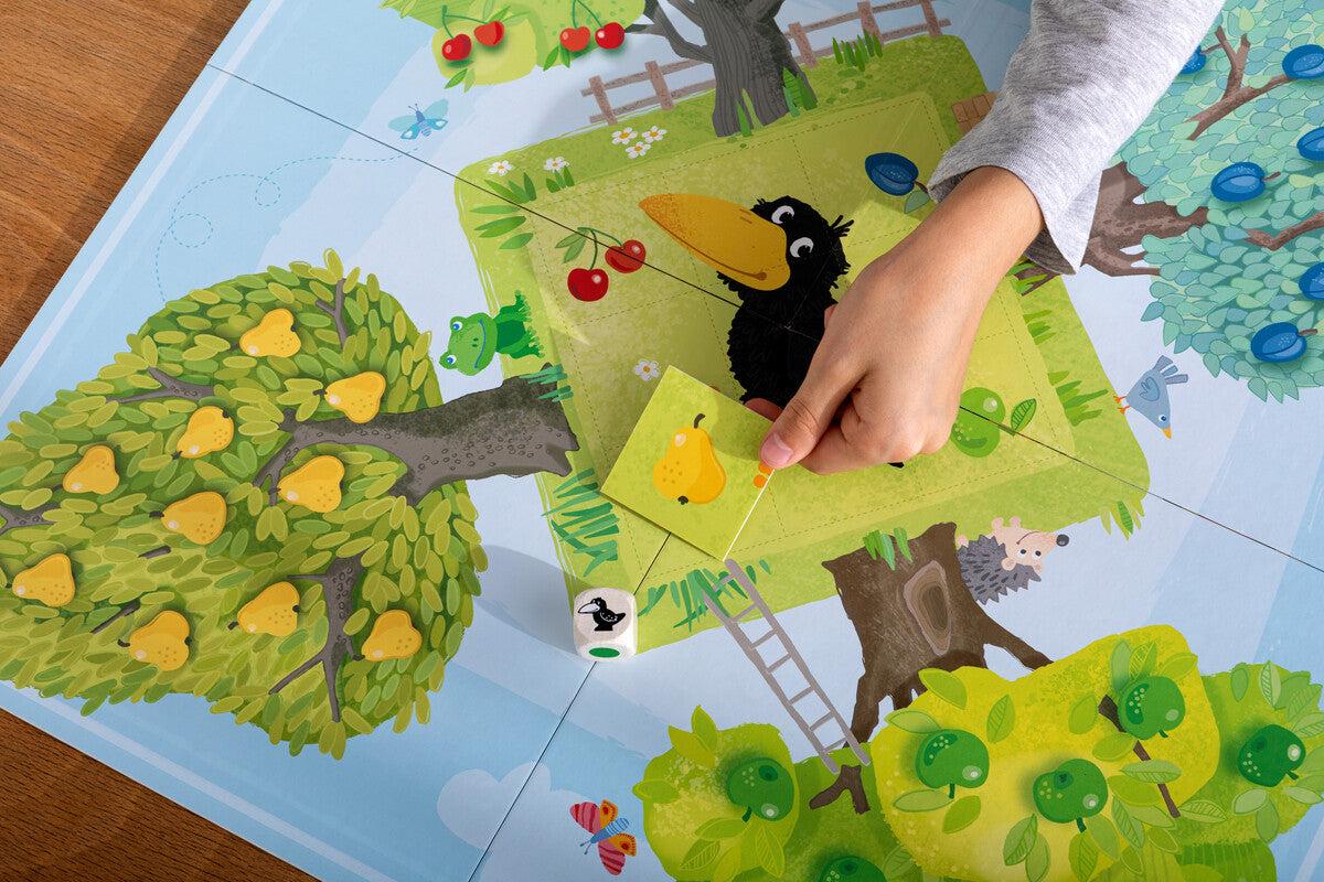 En El Frutal, los jugadores se turnan para lanzar el dado de colores y símbolos. Dependiendo del resultado, deberán recolectar las deliciosas frutas de los árboles o, si la suerte no está de su lado, colocar una pieza en el puzzle del cuervo. La clave es la cooperación: si logran recolectar toda la fruta en sus cestas antes de completar el puzzle del cuervo, ¡ganarán la partida todos juntos! Sus reglas son tan fáciles de entender que los pequeños aprenderán a jugar en un instante.