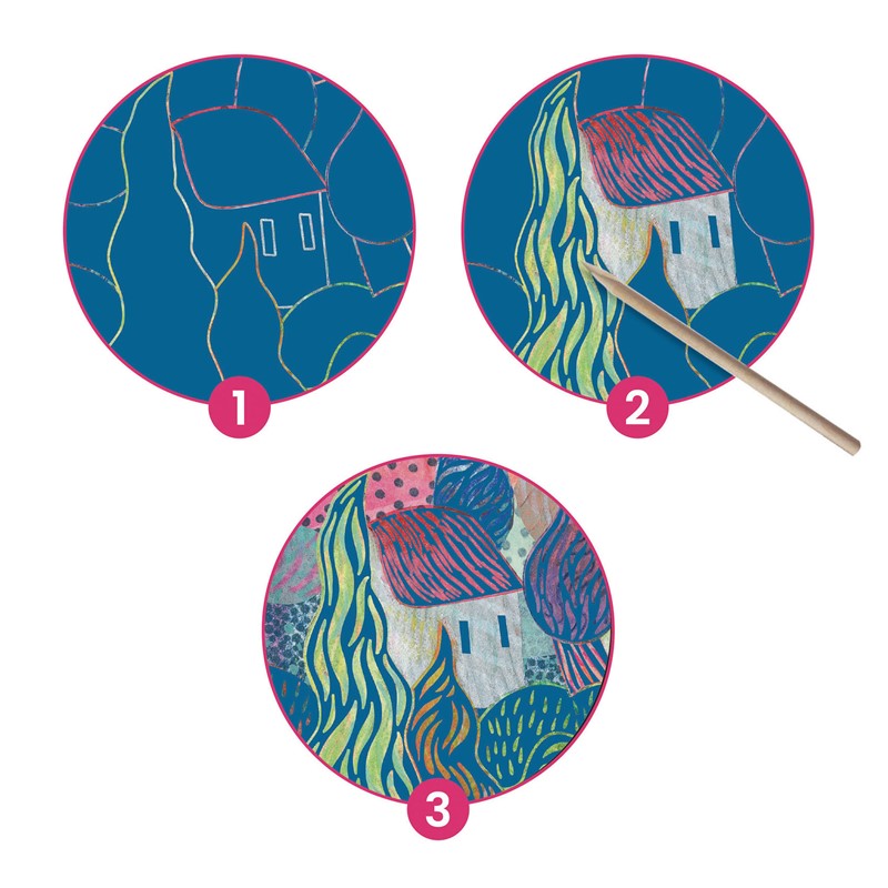 El set incluye cuatro láminas para rascar de 20 x 20 cm, que revelan vibrantes paisajes a medida que se usa el punzón de madera. El niño solo tiene que seguir los patrones de la guía o rascar libremente para crear obras de arte llenas de color y movimiento.