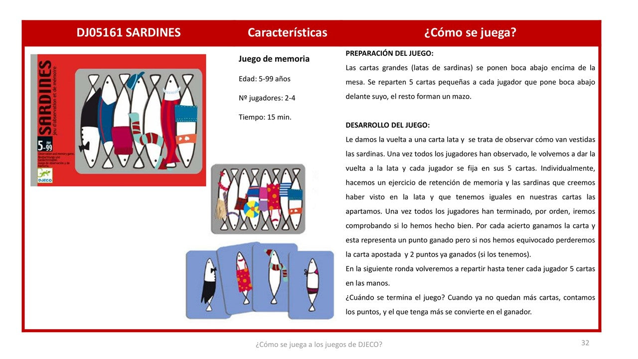 ¡Prepárate para un divertido chapuzón en la memoria con Sardines de Djeco! Este ingenioso juego de cartas te desafía a encontrar tantas sardinas como sea posible entre aquellas que se esconden en el fondo de la lata. En cada ronda, solo tendrás unos segundos para observar y memorizar las sardinas, para luego intentar pescarlas entre tus propias cartas. Cuando el mazo se agota, el jugador que haya capturado más sardinas ganará la partida. ¡Un festín para tu memoria visual con sardinas disfrazadas muy coloridas y divertidas!