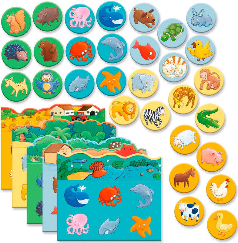 En cada tablero se pueden encontrar 6 animales fácilmente reconocibles para los más pequeños y pertenecientes a un mismo hábitat, para mejorar la comprensión y la asociación, a la vez que estimula la lógica y la atención.