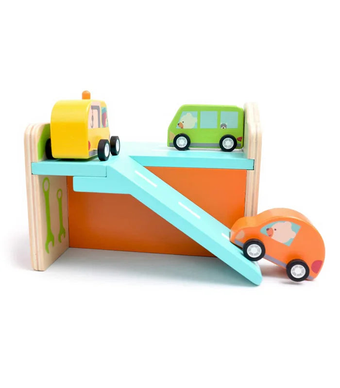 El set incluye: 1 garaje de madera y 3 coches de madera y plástico.
