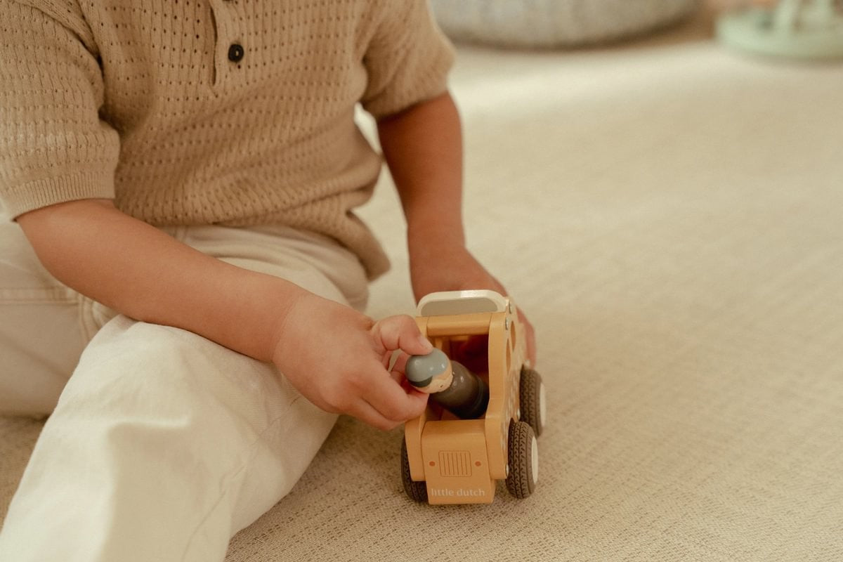 Con este precioso taxi de madera, tu pequeño puede recrear las bulliciosas calles de la ciudad y llevar a sus pasajeros a cualquier destino. Un juguete atemporal que estimula la imaginación.